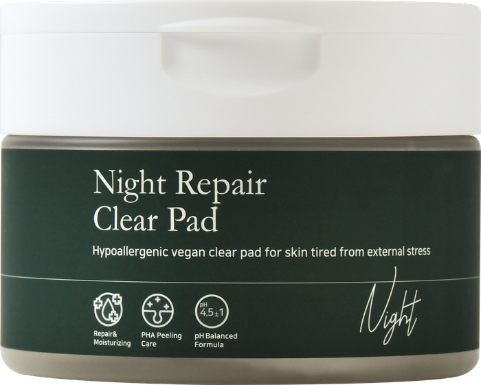 Night Repair Clear Pad нь өдөр тутмын шөнийн арчилгаанд зориулагдсан, арьсыг цэвэрлэх + гуужуулах + нөхөн сэргээх үйлчилгээг нэг дор үзүүлдэг тонер пад юм. Веган, хоёр талтай (dual embossing) бүтэцтэй, байгальд задардаг пад нь нэг тал нь арьсыг гуужуулж, нөгөө тал нь чийгшүүлдэг.